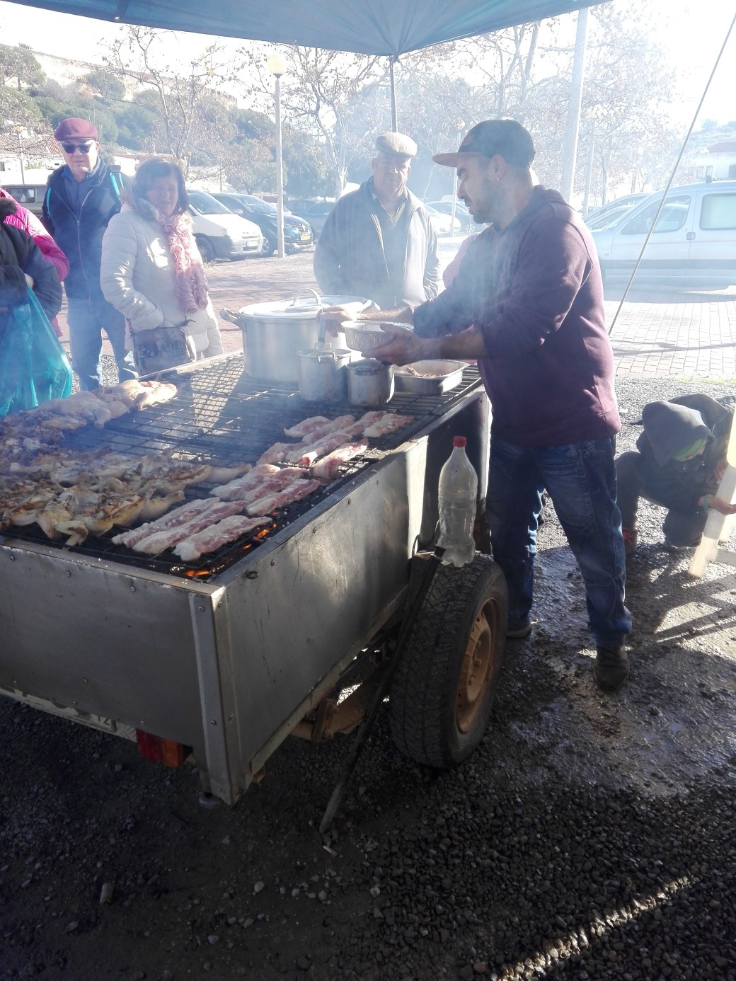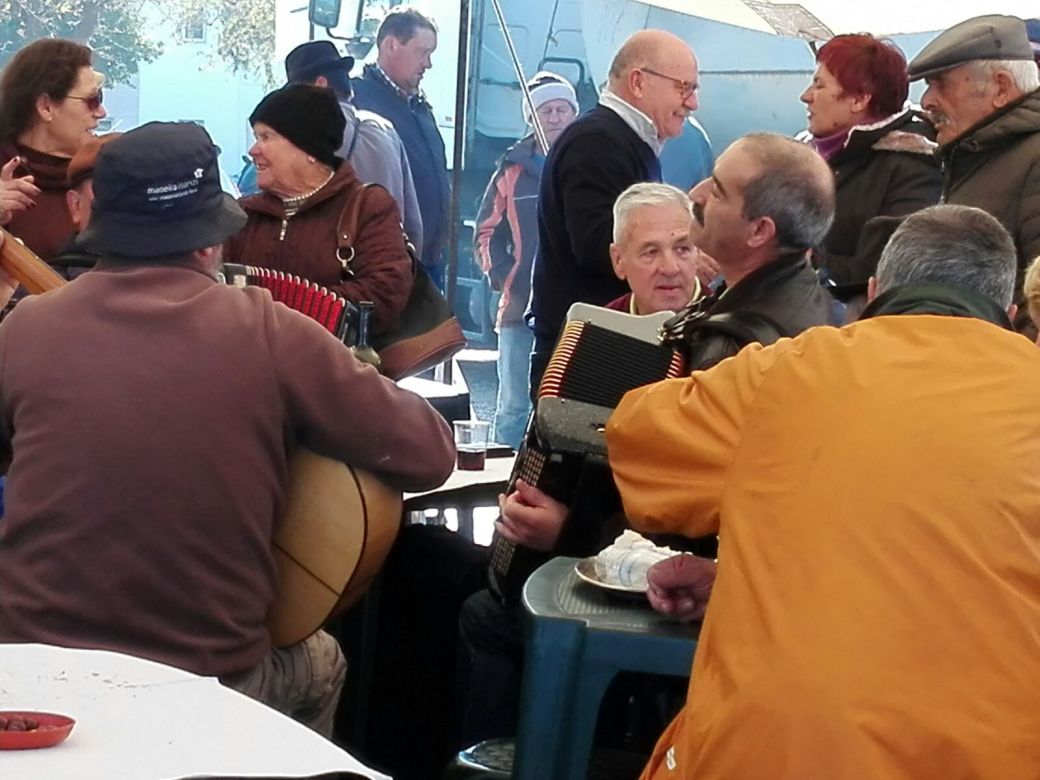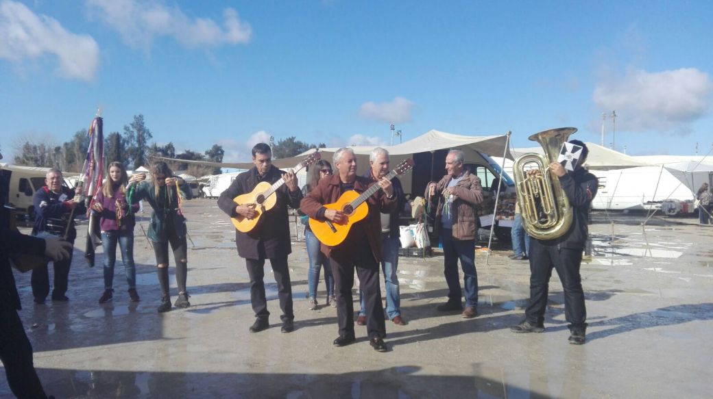 Así que a pesar de la lluvia y el barro en las instalaciones , nos pasamos la mañana en el mercadillo. A la hora del hamaiketako ( almuerzo en euskera), entre múscia floklorika, primero de unos del pueblo y luego con otros de fuera en forma de charanga, \cánticos y pendones: Frango y entremedos (pollo y tocineta a la brasa) y vino de Alentejo. Entre risas y música, ya sin la lluvia y empezando e sol que no nos dejó en todo el viaje, salvo curiosamente cuando volvimos a Castro Marim ya de camino a casa.