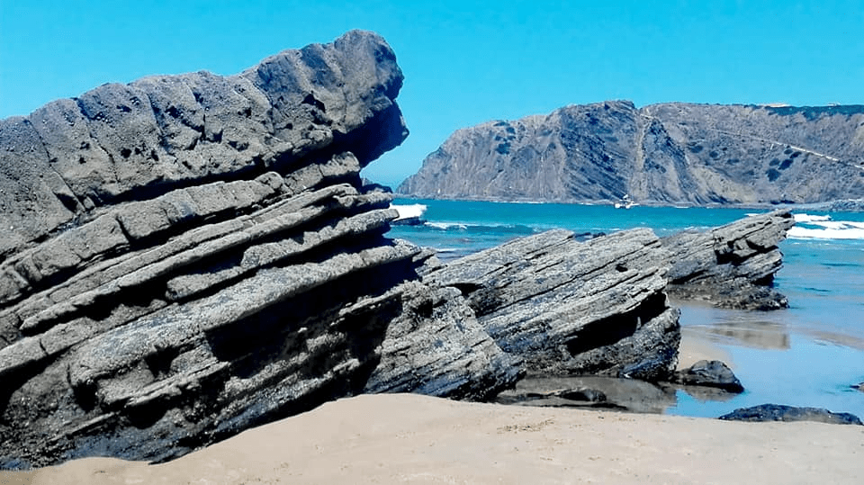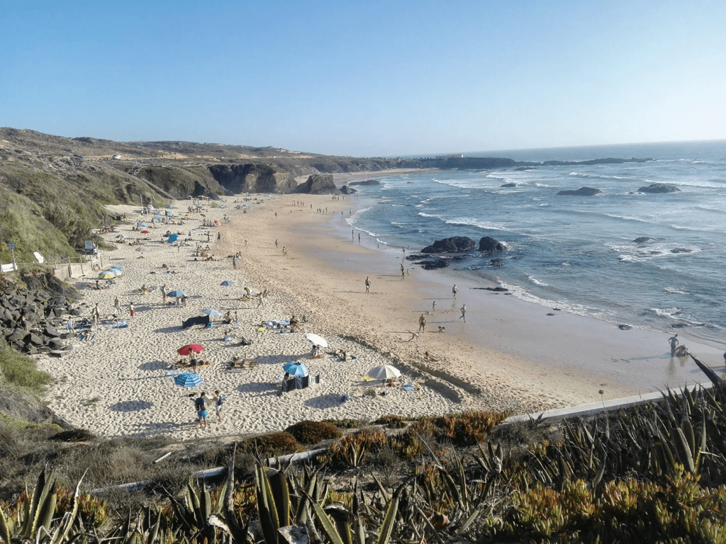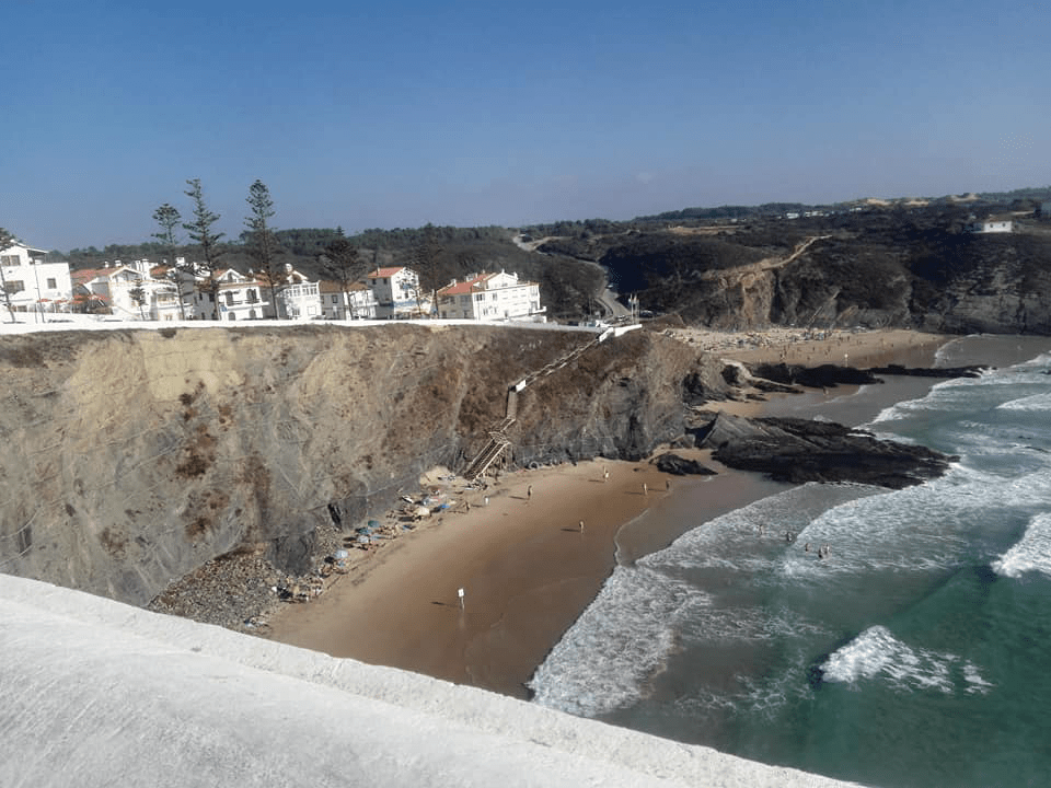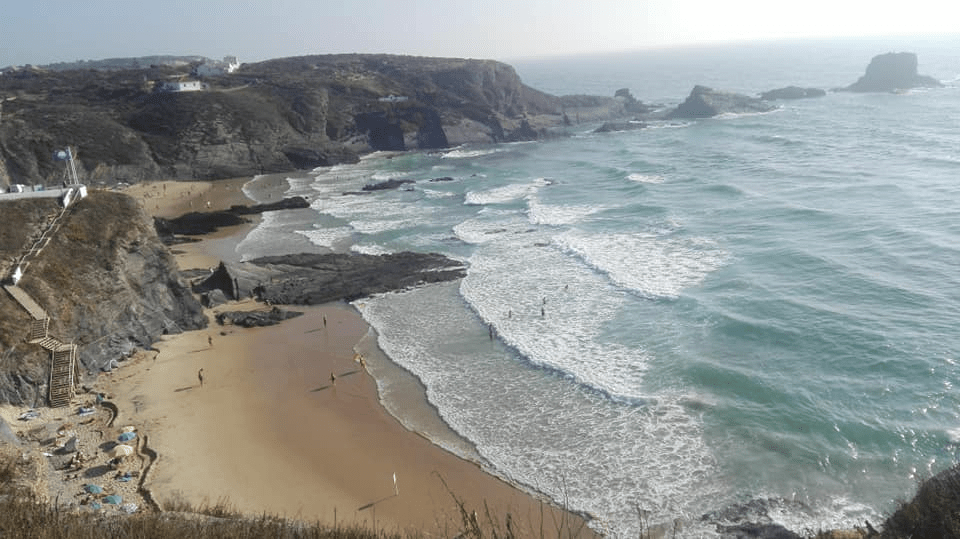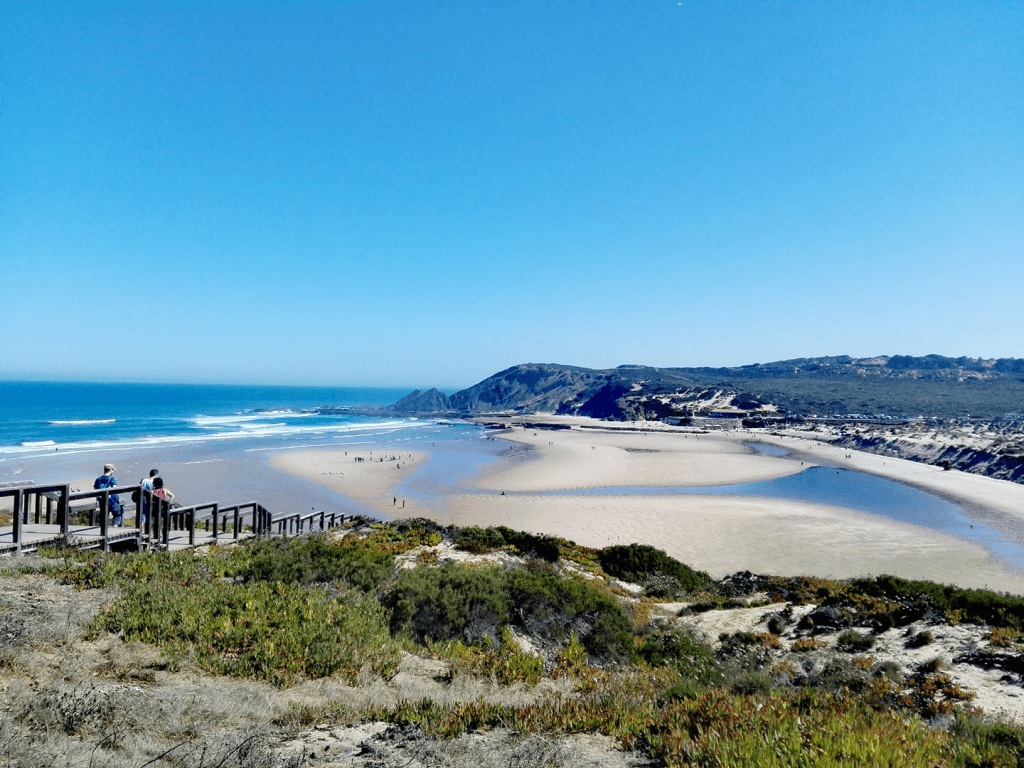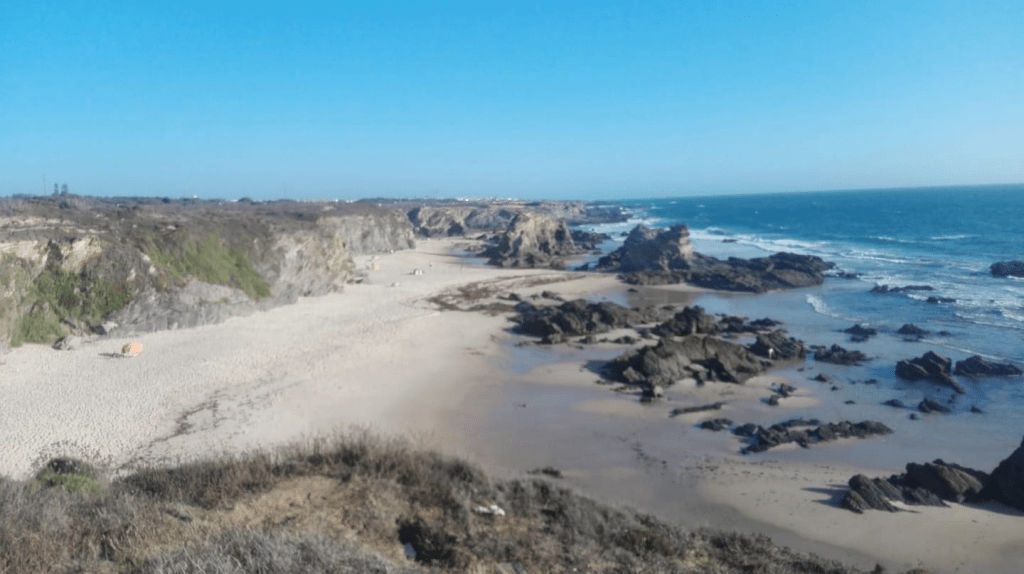 Entre medio de esas poblaciones , está la zona de Almograve que nos gustó más. En la playa de Almograve hasta nos bañamos. Y el paseo hasta el puerto de lapas tiene unas vistas espectaculares. Y en la zona del cabo sorprende ver agricultura intensiva sobre arena. Tuvo su Prestige y es parecida a nuestra Muxia en cuanto a su recuperación.