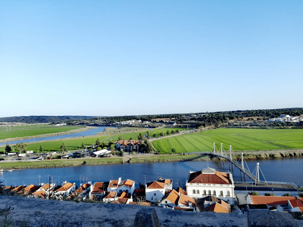 Habían ocupado la zona de ACs con carpas pero no nos importó. ¡Eran fiestas y se olía ya a las bifanas! Ya nos sentíamos a gusto. Es una población con unas vistas espectaculares en un meandro del río, entre prados de arroz. Aparcamos razonablemente en medio de una calle y ya sabíamos antes de patearlo que nos iba a gustar. Y disfrutamos.