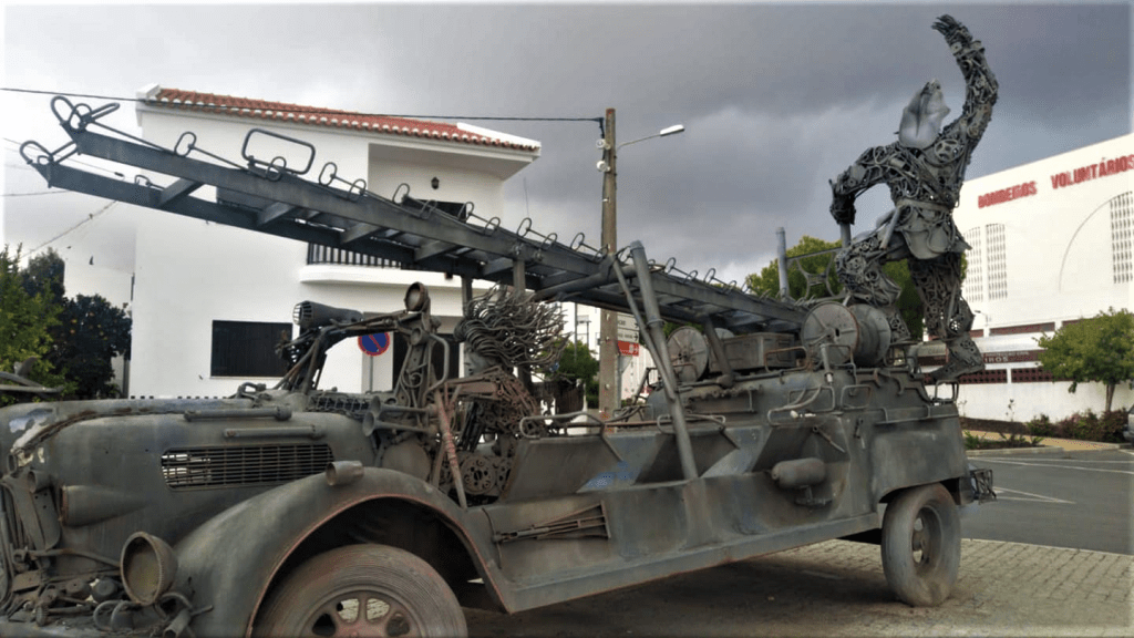 Almodovar bien merece un café. Puente con dudas si es romano o románico. Iglesia museo, buenas cafeterías y varias esculturas con mucho hierro dando honor a sus héroes locales, que los son de casi todos los portugueses: Lo bomberos Voluntarios. Una institución junto a la Casa de la Misericordia que están presentes en todas partes.
