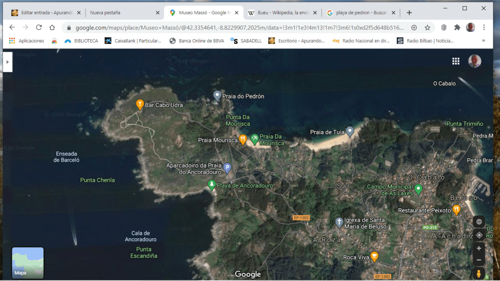 Bueu se nos atragantó al intentar aparcar. Es la salida mas usada para ir a la Isla de Ons. Gran historia pesquera y conservera. Y puerto pesquero de verdad. El museo Masso estaba cerrado, así que paseo y por la hora tocaba buscar sitio de pernocta. Por park4night, había un sitio justo a la entrada del Cabo de Udra. No lo conocíamos. Y efectivamente era especial. No se cuanto durará, se presta demasiado a que queramos pasar muchos días, con lo que deja de ser turismo itinerante para convertirse en acampada.