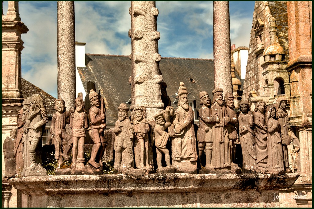 Guimilau, Calvario espectacular. Optamos por quedarnos a dormir, ya que al día siguiente hay Pardon o procesión de trajes regionales y procesión. Llovía tanto que ni salimos a la tarde y a la mañana siguiente con las katiuskas puestas vimos como no aparecían ni las lugareñas.