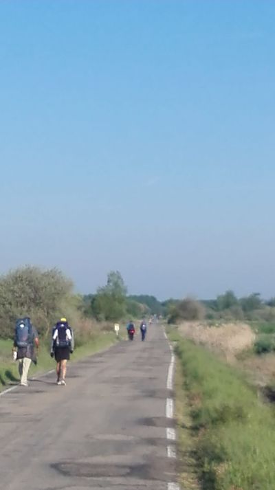 Nosotros como habíamos prometido, nos íbamos a saltar el tramo de los polígonos industriales, y esos escasos seis kilómetros, nos separan de la gente que conocíamos. Luego siempre se recupera a alguien pero se nota.